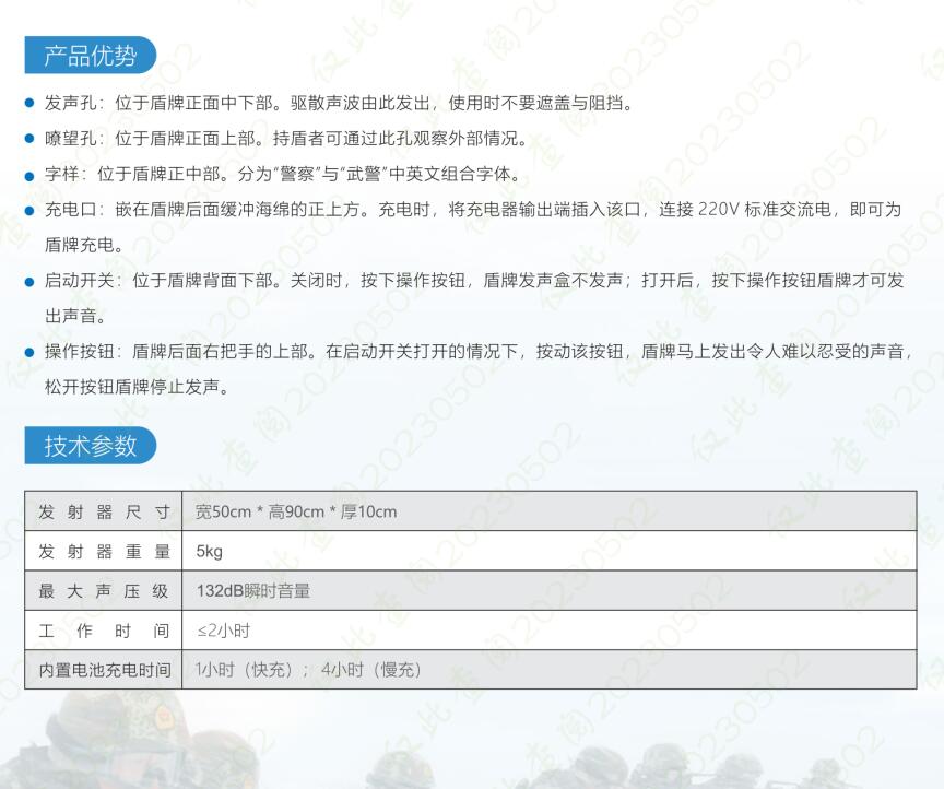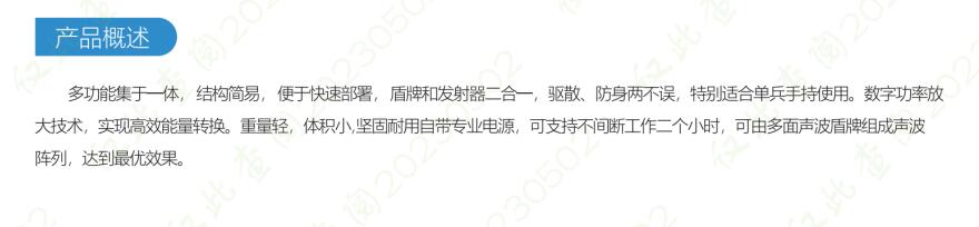 多功能集於一體,結(jié)構簡易,便於(yú)快速部署,盾牌和(hé)發射器二合一,驅散、防身兩不誤,特別適合單兵手持使用。數字功率放大技術,實現高效能量轉換。重量輕,體(tǐ)積小堅固耐用(yòng)自帶(dài)專業電源,可支持不間斷工(gōng)作二個小時,可由多麵聲(shēng)波盾牌組成聲波陣列,達到最優效果。