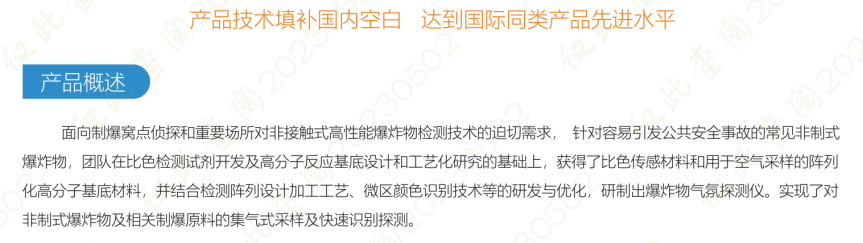 麵向製爆窩點偵探和重要場所對(duì)非接觸式高性能爆炸物檢測技術的迫切需求,針對(duì)容易(yì)引發公共安全事故的常見非製式爆炸(zhà)物(wù),團隊(duì)在比色檢測試劑開發及高分子反應基底設計和工(gōng)藝化研究的基礎上,獲得(dé)了比色傳感材料和用於空氣采樣的陣(zhèn)列化高分子基底材料(liào),並結合檢測陣列設(shè)計加工工藝、微區顏色識別技術等的研發與優(yōu)化,研製(zhì)出爆(bào)炸物(wù)氣氛探測儀(yí)。實現了對非製式(shì)爆炸物及相關製爆原(yuán)料的集氣式采樣及快速識(shí)別探測。