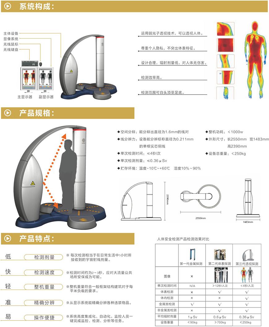 單次檢測劑量為0.36pSv,僅相當於乘坐飛機(jī)4分(fèn)鍾(zhōng)所接受(shòu)的自然輻射,接近天然本地(dì),以稱無損傷人體(tǐ)安檢(jiǎn)儀。