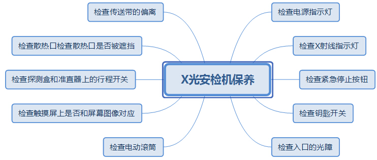 根本操作是從上往下,X光安(ān)檢機上方2個指示燈和緊急按鈕和鑰匙開關→觸屏與圖屏(píng)對應→入口光(guāng)障→滾筒→行(háng)程開關→傳送帶→散熱(rè)口